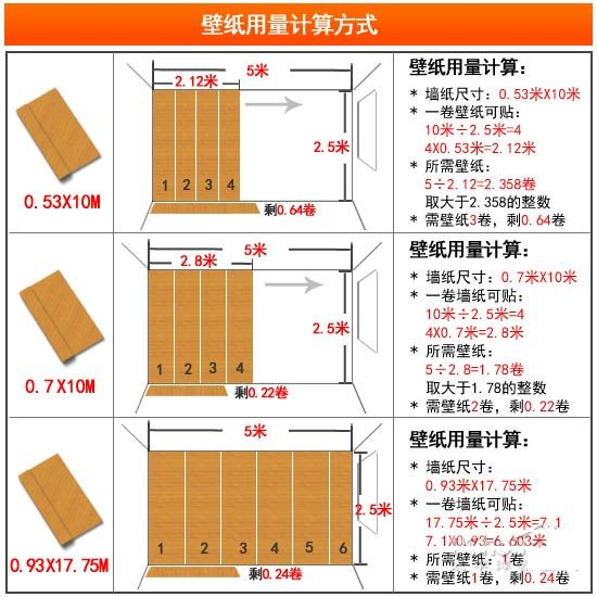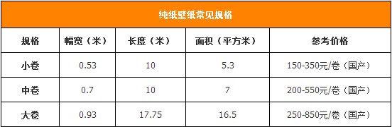 在選擇壁紙的時候,除了要看適用空間外,還需要看空間的面積,根據(jù)實際的面積來挑選不同尺寸的壁紙。純紙壁紙的常見尺寸有三種,0.53x10米/卷、0.7x10米/卷和0.93x17.75米/卷。如:一個5mx2.5m的墻面鋪貼壁紙,小卷壁紙需要購買3卷、而中卷需要2卷、大卷的需要1卷。